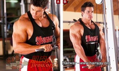 身體站直,雙手握住手柄,通過三頭肌將手柄拉至腰下方,然後慢慢回原位。