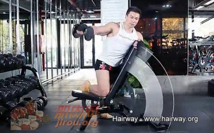 在做開始姿勢的時候,雙手握住啞鈴,雙腿稍微彎曲,身體略向前傾斜,同樣肘部也稍微呈彎曲狀態。