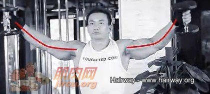 您可以交替著做,側身靠在平板上,或者一隻手抓住固定的支點,如此更能完美的針對三角肌訓練,並能使三角肌變的圓滿。