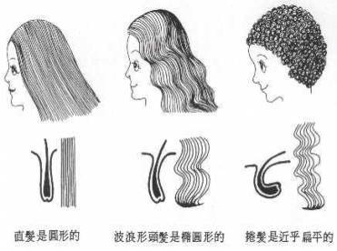 毛髮是表皮的變形物,是人體的一部分。毛髮的形狀、顏色,因種族及所生部位而有不同,有些是直的,有些是波浪形的,有些則是十分捲曲的。從顯微鏡下觀察其橫斷面,雖沒有絕對的規則可循,然事實上可以發現:直髮是從圓形的髮胞中長出來的,所以每根頭髮的斷面都是圓的,其毛囊在皮內的位置是直立的,東方人皆屬之;波浪形的頭髮是從橢圓形的髮胞中長出來的,所以每根頭髮的斷面都是橢圓形的,其毛囊在皮內的位置是歪斜的,西歐人皆屬之;捲髮則是從扁平的髮胞中長出來的,所以每根頭髮的斷面都是近乎扁平的,其毛囊在皮內的位置可能有少數的彎曲,以非洲、印度洋諸島等熱帶地區的人較多。
