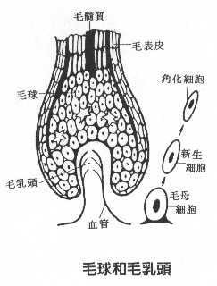 毛乳頭:呈微小球果形的突起,大小恰好嵌入毛球內。毛乳頭裹有豐富的血液和神經的分布,並有專司毛髮營養的