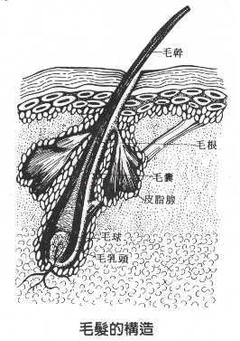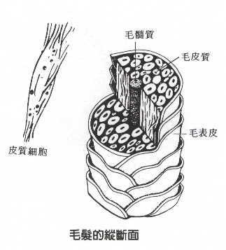 毛髮是一種已死的角化物質,我們觀察毛髮的縱斷面,自外向內向可發現毛表皮(Cuticle)、毛皮質(Cortex)、毛髓質(Medulla)三部分層層相裹而成。