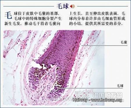 毛球位於毛髮的根部,是最寬大的部分,有許多未分化的細胞,是一種增殖能力和分化潛能很強的細胞群。