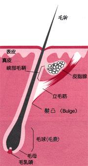 這裡,我們先從頭髮的結構說起。人類的頭髮由髮根和發乾兩部分組成。頭髮在頭皮下面的部分稱為髮根,並不為人所見,被毛囊所保護。每個毛囊只生長一根頭髮,毛囊下部膨出的部位叫毛球,是頭髮的起始端,在毛球上有色素細胞。毛球的最底部的凹陷稱為毛乳頭,它是一團伸入毛球內的結締組織,含有血管和神經,毛乳頭為生長中的頭髮提供營養和氧氣。如果毛乳頭被破壞或退化,頭髮就停止生長並逐漸脫落。
