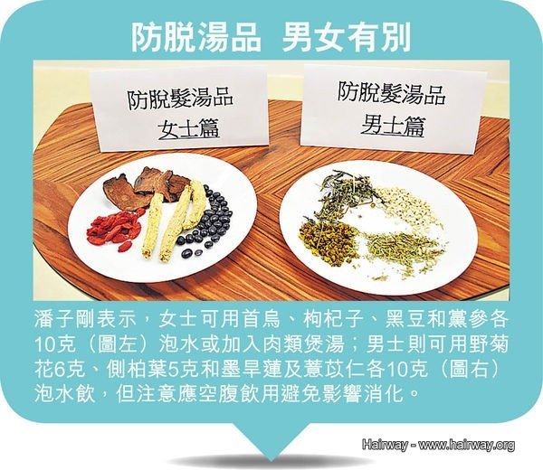 潘子剛指,過半脫髮個案均與「上熱下寒」有關,要處理脫髮亦要先理順氣血,「身體好,頭髮就好」。他表示,要改善「上熱下寒」,應先以外敷內服清熱去濕,然後才循序漸進補充身體氣血,否則只會加重病情。