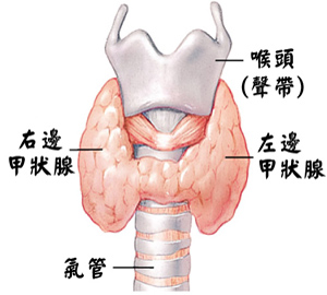 甲狀腺是位於頸部前方正中,在皮膚及肌肉層之下,位於輪狀軟骨下方,緊貼氣管軟骨。它的形狀就像一隻蝴蝶,蝴蝶的兩邊翅膀就是甲狀腺的左右兩葉,中間部份稱為峽,兩葉大小長度4-5公分,厚約1 公分,重15-20克,甲狀腺會製造甲狀腺激素是一種含碘的蛋白質,它們是生命不可或缺的要素。顯微鏡下看來,甲狀腺是由許多慮泡所組織成的,每個濾泡就像一個中空的球形,在濾泡腔中含有膠體,內儲存有甲狀腺荷爾蒙。