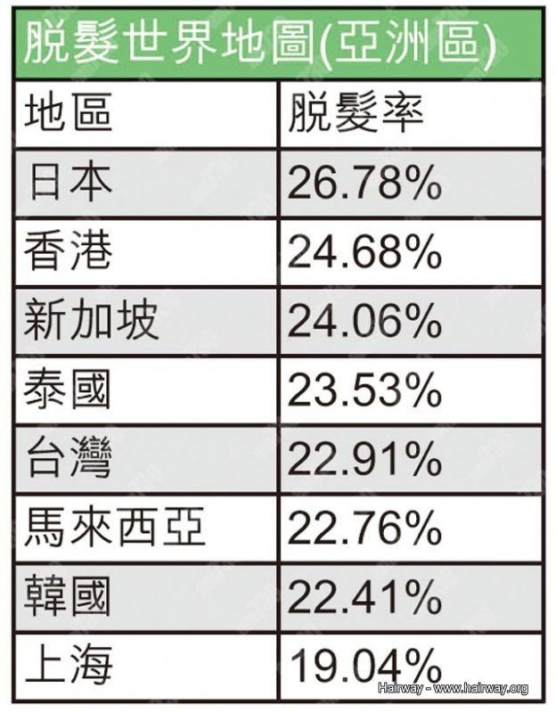 脫髮問題困擾不少男士,除影響外表、自信,更影響日常社交。根據08年日本發布的「脫髮世界地圖」,歐洲男士脫髮問題最為嚴重,每2名男士便有1人脫髮。而亞洲最嚴重的地方是日本,其次是香港,有近四分一的男士有脫髮問題,情況令人關注。