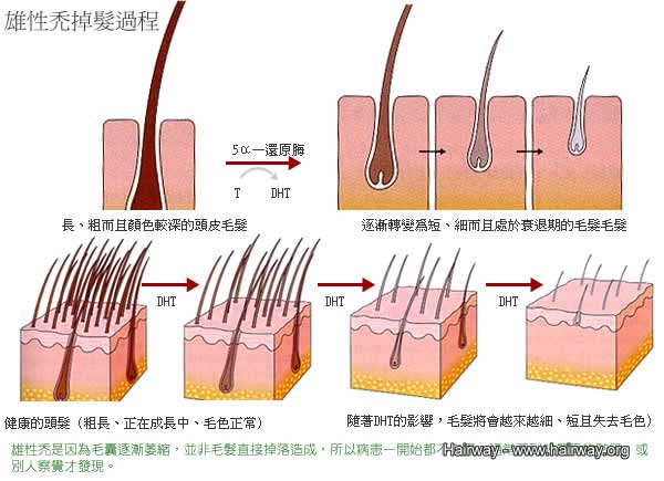 重新檢視雄性禿的本質—Androgenetic Alopecia,其中兩大基本要素Androgen雄性素,男性荷爾蒙與Genetic遺傳,意味著此一型禿髮與荷爾蒙及遺傳體質有著莫大關係;男女皆有男性荷爾蒙,只是量的高低有所不同而已。而雄性禿患者的毛囊對男性荷爾蒙特別敏感,容易進入休止期,頭髮容易脫落或只剩下細小的毫毛,在男女性皆可能產生,只是女性集中在頭頂,頭髮密度變稀薄,不像男性會有髮線日漸後移、頭頂露出光禿的頭皮現象,隨著年紀增長,落髮程度會增加,直到頂上無毛。