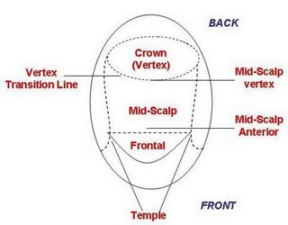 男性雄性禿的典型特徵,就是出現頭頂與前額處的掉髮現象。而耳際兩側及後腦區域,因為基因特性與DHT荷爾蒙的濃度較低,所以很少掉髮,即使會收到影響,也往往是較晚期的雄性禿。雄性禿的最大難題,在於前額髮線的頭髮逐漸變細或變少,導致髮量逐漸稀疏,或是髮線逐漸往後移,在前額兩旁髮際線或是鬢角上方的區域(Temple)後退最明顯,遂呈現M型的掉髮區域(frontal baldness)。之所以如此,是因為前額區域的毛囊,有較高的5a還原脢活性,導致毛囊受到DHT的影響程度更為明顯,過高的DHT讓毛囊以較快的速度萎縮,緊而導致各種產品在治療前額掉髮上,總是成效不彰。