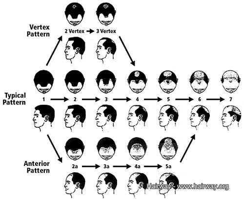 台北醫學大學、萬芳醫學中心皮膚科副教授蔡仁雨說明,雄性禿又稱型態禿,Norwood∼Hamilton的分類圖表(見附表,轉載自台灣醫界2008年8月期刊),將雄性禿症狀分為7型。剛開始,前額髮線稍微往後退,形成2個三角形,稱為第1、2型。當2個三角形的頂尖持續退到耳朵上方,即為第3型。可是,第3型有另一種亞型,即患者頭頂漩渦處開始變稀疏,稱為「頭頂型」。若狀況持續惡化,就到第4型;當頭頂的頭髮完全掉光,只剩前額的少許頭髮,即為第5型。當頭頂的頭髮全部禿光,為第6型。至於第7型,除了頭頂全禿,兩側耳際上方的頭髮也開始往下移,為最嚴重的禿髮情況。蔡仁雨進一步指出,有人在第2型後,並非從頭頂開始禿,而是前額的髮線逐漸向後移,這種變型稱為「前額型」。他特別強調,「並非每個人都會進展到第7型,也有人到第5、6型就停住,因此,需依據患者的家族史、個別史、啟動年齡等,才能預測最後症狀。」很多人發現自己開始禿髮,會覺得絕望,對復原不抱期望。李美青澄清,「其實雄性禿經過治療,不但能讓禿髮狀況不再惡化,還可能讓頭髮回復生長。」她也提醒,如果出現雄性禿,「愈早治療,效果愈好。」