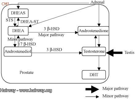 『DHEA- S可經過17β-羥基類固醇脫氫酶(17beta-hydroxysteroid dehydrogenase, 17β-HSD)的催化,形成雄烯二醇(androstenediol),再經過3β-羥基類固醇脫氫酶(3beta-hydroxysteroid dehydrogenase, 3β-HSD)的催化,即形成為睪固酮(testosterone)。(引用自皮膚科王修含醫師的部落格)』