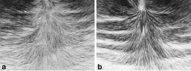 5%的濃度:a為實驗前,b為實驗後:四個月後,毛髮密度、長度皆有所增加。