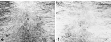 安慰劑治療:e為實驗前,f為實驗後:四個月後,沒有毛髮再生的情況。