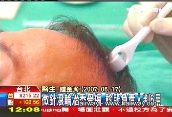 醫生鍾金源(2007.05.17):「當我們微針在刺的時候,就會把這些藥物帶進去。」一次療程90分鐘,之後使用藍光殺菌,紅光修補,說的神奇,但也不是對每個人都有效,一名郭姓男子花了2萬9千5百元,購買微針滾輪生髮課程,怎麼知道頭頂上毛髮沒多太多,倒是頭皮流血,痛的不得了,氣的向檢方檢舉,法院審理後也認為診所讓不具醫師的女子,替郭姓男子進行侵入性的滾輪療法,已經違反醫師法,判處當時的診所童姓負責人,6個月徒刑。