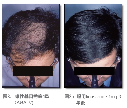 Finasteride透過競爭性的抑制type II 5α-reductase,使testosterone無法轉換成DHT,來減少DHT對毛囊的作用。根據大規模的臨床使用報告,1553位18-41歲男性病人(AGA type IIv, IIIv, IV, V)使用finasteride 1mg達2年的時間,83%的人可以維持現有髮量,甚至變多。其中在頭頂禿髮部位,30%的人是輕度的改善,31%的人則有中度的改善,而有5%的人則感到大幅度的進步。至於在前額禿髮部位,38%的人是輕度的改善,4%的人有中度的改善,但沒有人是大幅改善(12)(圖3)。這一群病人再持續使用到5年的時間,雖然整體改善幅度略有下降,但仍有9成的病人感到滿意。