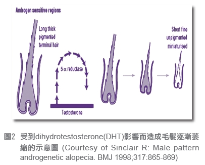 造成毛囊萎縮的原因,主要為遺傳基因(geneticsusceptibility);其次則是雄性荷爾蒙的影響,其中以由睪固酮 (testosterone)經5α還原?(5α-reductase)作用而成的二氫睪固酮 (dihydrotestosterone,DHT)是主要元兇。雄性禿病人的前額與頭頂處頭皮 (frontal and vertex scalp)的5α-reductase活性有明顯增加的情形(9),因此這部份頭皮DHT的濃度會比他處來的高,DHT與毛囊上androgen receptor結合後進入細胞核中,使毛囊細胞無法進行蛋白的合成,成為休止期毛髮,而後逐漸萎縮消失。