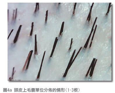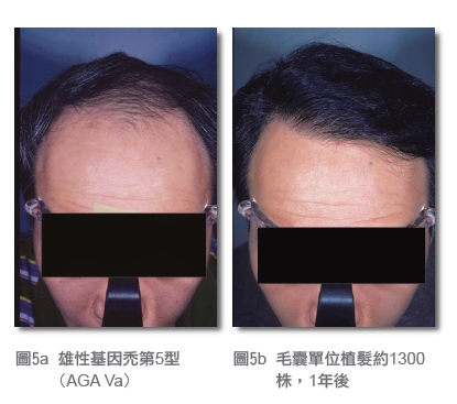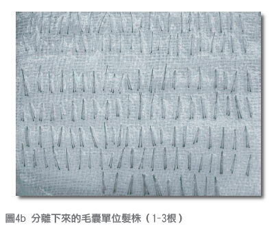 這即是所謂毛囊單位(follicular unit)的觀念:一個毛囊單位包含1-4根的永久毛髮(terminal hair)以及旁邊附屬的皮脂腺和豎毛肌(圖4)。根據這個觀念所發展出的「毛囊單位植髮術」(follicular unit transplantation)(17),就是分離完整毛囊單位(含1~4個毛囊)後植入禿髮處,植入後的毛髮像其他部位的毛髮一般自然生長,而且比以往手術更密、更自然,成功率在九成五到九成八以上,是目前植髮手術的主流(圖5)。植髮手術屬於門診手術,採局部麻醉。手術時間視植髮量而定,約3~4小時可完成。植髮原理雖簡單,但手術是否成功取決於醫師的經驗與技術及整個植髮團隊技術人員的訓練。在技術上有一些重點需注意: