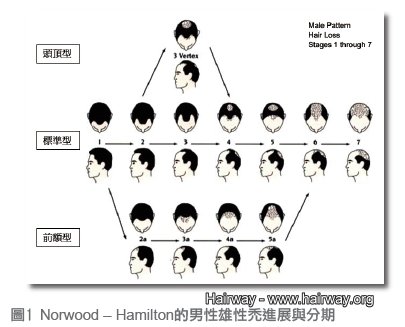 有很多的學者針對男性雄性禿的型態與嚴重度提出許多分期的標準,但至目前為止最被廣為接受的還是Hamilton和Norwood的分類(4,5):主要是從最輕微的前額髮線兩側稍微往後退的第一、二型到整個頭頂禿光,僅剩後枕與兩側顳骨部頭髮的第七型,以及頭頂禿與前額禿兩種亞型(圖1)。根據作者在民國95年10月至96年3月約半年來收集了500位因掉髮來求診的病人,其中男性約佔七成 (346/500),以20-40歲年齡層的人佔絕大多數87% (302/346)。在男性病患當中診斷為雄性禿的則高達91% (317/346)。落髮型態以typeII(24.3%),type III(23%)及type III(22.7%)居多,大致跟國外的報告相類似(4-7)。
