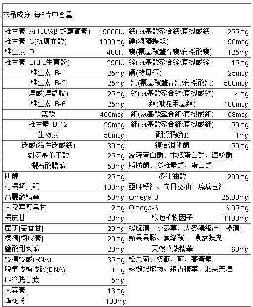 本品是美國著名健康食品生產商Puritan's Pride的最權威產品,一直代表Puritan公司參與北美MacWilliam權威評測機構的選評。該產品提供66種人體必須的維生素、礦物質、不飽和脂肪酸、天然抗氧化因子、植物因子及免疫因子,包括維生素A、C、D、E、B1、B2、B6、B12、煙酸、葉酸、泛酸、生物素、鈣、碘、鎂、鋅、硒、銅、錳、鉻、鉬、鉀、硼、鹽酸甜菜鹼、柑橘類黃酮、高麗參、橘皮甘、蘆丁、櫟精、RNA、DNA、L-谷胱甘肽、蜂花粉、大蒜素、菠羅蛋白酶、木瓜蛋白酶、澱粉酶、脂肪酶、纖維素酶、蛋白酶、嗜酸菌混合物、亞麻籽油、向日葵油、琉璃苣油、Omega-3、Omega-6、綠色植物混合物、天然草藥混合物等組合而成。本品經美國GMP(優良製造實踐)認證生產,不含任何人工色素、香料、防腐,實為中國消費者的理想產品。