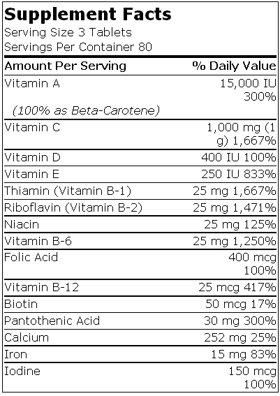 Ingredients: Proprietary Green Blend (Spirulina, Oat Bran, Wheat Grass, Barley Juice Concentrate, Chlorella, Apple Pectin, Sodium Copper Chlorophyllin), Ascorbic Acid, Cellulose (Plant Origin), d-Alpha Tocopheryl Acid Succinate, Proprietary Vegetable Oil Blend (Flaxseed Oil, Borage Oil and Sunflower Oil), Croscarmellose, Acacia Gum, Silica, Citrus Bioflavonoids, Beta-Carotene, Cellulose Coating, Calcium Amino Acid Chelate, Calcium Spirulina Chelate, Calcium Ascorbate, Calcium Citrate, Calcium Ketoglutarate, Calcium Malate, Calcium Succinate, Proprietary Herbal Blend (Echinacea, Milk Thistle, Cayenne Pepper, Ginger, Ginkgo Biloba, Goldenseal), Choline Bitartrate, Proprietary Enzyme Blend (Bromelain, Papain, Amylase, Lipase, Cellulase, Protease), Ferrous Fumarate, Manganese Gluconate, Ribonucleic Acid, d-Calcium Pantothenate, Magnesium 125 mg 31% Zinc 15 mg 100% Selenium 25 mcg 36% Copper 0.5 mg 25% Manganese 4 mg 200% Chromium 100 mcg 83% Molybdenum 51 mcg 68% Potassium 50 mg 1% Choline Bitartrate 50 mg * Inositol 25 mg * PABA (Para-Aminobenzoic Acid) 25 mg * Boron 1 mg * Citrus Bioflavonoids Complex 100 mg * (Citrus spp.) (fruit) Korean Ginseng 25 mg * (Panax ginseng) (root) Hesperidin Complex 20 mg * (Citrus spp.) (fruit) Rutin 20 mg * Quercetin 20 mg * Betaine Hydrochloride 20 mg * DNA (Deoxyribonucleic Acid) 1 mg * Magnesium Amino Acid Chelate, Magnesium Spirulina Chelate, Magnesium Ascorbate, Magnesium Citrate, Magnesium Ketoglutarate, Magnesium Malate, Magnesium Succinate, Kelp, Thiamin Mononitrate, Pyridoxine Hydrochloride, Riboflavin, Inositol, Para-Aminobenzoic Acid, Korean Ginseng (Panax ginseng), Proprietary Probiotic Blend (L. acidophilus, L. bifidus, L. bulgaricus), Niacinamide, Quercetin, Rutin, Hesperidin, Betaine Hydrochloride, Potassium Amino Acid Chelate, Potassium Spirulina Chelate, Potassium Ascorbate, Potassium Citrate, Potassium Ketoglutarate, Potassium Malate, Potassium Succinate, Garlic, Sodium Borate, Manganese Amino Acid Chelate, Vegetable Magnesium Stearate, Manganese Spirulina Chelate, Manganese Ascorbate, Manganese Citrate, Manganese Ketoglutarate, Manganese Malate, RNA (Ribonucleic Acid) 35 mg * L-Glutathione 5 mg * Garlic 13 mg * (Allium sativum) (bulb) Proprietary Enzyme Blend 50 mg * (Bromelain (from Pineapple), Papain (Papaya Enzyme), Amylase, Lipase, Cellulase, Protease) Proprietary Probiotic Blend 25 mg * (L. acidophilus, L. bifidus, L. bulgaricus) Proprietary Vegetable Oil Blend 200 mg * (Flaxseed Oil, Sunflower Seed Oil, Borage Oil) (Contains Omega-3 57 mg and Omega-6 65 mg) Proprietary Green Blend 1,180 mg * (Spirulina (Spirulina platensis) (plant), Oat Bran (Avena sativa) (seed), Wheat Grass (Triticum sativum) (aerial), Barley Juice Concentrate (Hordeum vulgare) (plant), Chlorella (Algae spp.) (fruit), Apple Pectin (fruit), Sodium Copper Chlorophyllin) Proprietary Herbal Blend 60 mg * (Echinacea (Echinacea purpurea) (aerial), Milk Thistle (Silybum marianum) (seed), Cayenne Pepper (Capsicum annuum) (fruit), Ginger (Zingiber officinale) (root), Ginkgo Biloba (Ginkgo biloba) (leaf), Goldenseal (Hydrastis canadensis) (root)) *Daily Value not established. Manganese Succinate, L-Glutathione, Selenomethionine, Niacin, Maltodextrin, Ergocalciferol, Zinc Amino Acid Chelate, Zinc Spirulina Chelate, Mannitol, Zinc Ascorbate, Zinc Citrate, Zinc Ketoglutarate, Zinc Malate, Zinc Succinate, Cupric Amino Acid Chelate, Cupric Spirulina Chelate, Molybdate Amino Acid Chelate, Deoxyribonucleic Acid, Cupric Ascorbate, Cupric Citrate, Cupric Ketoglutarate, Cupric Malate, Cupric Succinate, Chromax� Chromium Picolinate, Molybdate Spirulina Chelate, Molybdate Ascorbate, Folic Acid, Molybdate Citrate, Molybdate Ketoglutarate, Molybdate Malate, Molybdate Succinate, Biotin, Magnesium Gluconate, Zinc Gluconate, Potassium Gluconate, Pyridoxyl 5� Phosphate, Riboflavin 5� Phosphate, Coenzyme B-12, Cyanocobalamin. Contains milk and wheat ingredients.