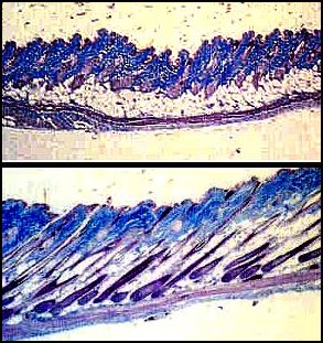 圖中是以顯微鏡相同倍數放大後的照片。上圖是沒有使用銅胜肽的老鼠皮膚。下圖是有使用銅胜肽的老鼠皮膚。注意下圖的紫色部分顯示出較大的毛囊、白色部分是較厚的皮下脂肪、皮膚厚度亦有所增加。
