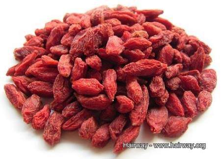 枸杞子作為頭髮的天然養料,可以與菊花一起泡茶喝。枸杞子味甘性平,有補腎、滋陰、養肝、明目、益氣等功效,為藥食兩用佳品。從詩經「集於苞杞」時起,枸杞子用於醫藥,迄今已有3000餘年的歷史。現代研究發現,枸杞子中還含有多糖、單糖、甜菜鹼、脂肪酸、蛋白質和各種維生素。據最新出版的我國食物成分表記載,枸杞中胡蘿蔔素含量顯著高於水果蔬菜,還含有維生素E、維生素D、磷脂及硒等成分。它可防止脫髮,使頭髮烏黑發亮,同時對人體必需的維生素及微量元素缺乏而引起的黃發、白髮、等均有顯著療效。由於其還能促進頭髮黑色素的生成,也是對付斑禿的好「武器」。