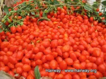 含有美容必需的維生素A1、B2、C和微量元素鈣、磷、鐵等,尤以維生素A和C含量高,在化妝品中添加枸杞子的提取物,可防止脫髮,使頭髮烏黑發亮,同時對人體必需的維生素及微量元素缺乏而引起的黃發、白髮、面色無華、皮膚乾燥等均有顯著療效。由於它還能促進頭髮黑色素的生成,對斑禿有很好的療效。