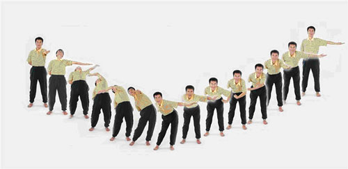 2上半身前彎約45度,左手模擬持刀姿勢,手掌朝內,緩慢地向腹部迴旋,「切」下腹部過剩的肥肉。繼而,肥肉置於「刀」上(即掌上),手掌繼續朝外旋轉且從腋下伸出,至完全向左側水平伸直。過程中身體從前彎而逐漸伸直(圖○16~○21)。