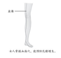 這位女病人就是典型的肝郁氣滯性的乳腺增生病。於是我就給她疏肝理氣,使她氣血通暢。首先讓她吃柴胡疏肝丸,一天吃三次,一次吃八粒。然後給她揉揉肝經和脾經上的血海穴,每天早晚各一次,每次三分鐘。並讓她凡事想開,不要動氣。就這樣兩個星期後,她的乳房脹痛就明顯好轉了,一直堅持了半年,她的乳房脹痛就再也沒有犯過了,即使在經期也不脹痛了。