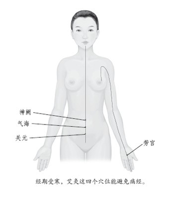 事實上,女性經期受寒,會使盆腔內的血管收縮,導致卵巢功能紊亂,可引起痛經,月經量過少,甚至閉經。不過,不必要特別擔心,用艾條灸一灸身上的勞宮、神闕、氣海、關元穴就可以,而且還可以使用「古方溫經貼」來治療。