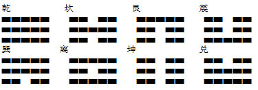 中國人發明了八個符號,分別代表天、地、風、雷、水、火、山、澤這八種自然現象。這八個符號是: