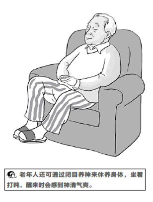 老年人還可以通過閉目養神來休養身體,坐著打個盹,醒來時會感到神清氣爽,有時甚至比躺在床上睡覺更有益。有些老人坐著不能入睡,但只要閉上眼睛,不說話,收攝心神,休息片刻,也一樣能達到午睡的效果。