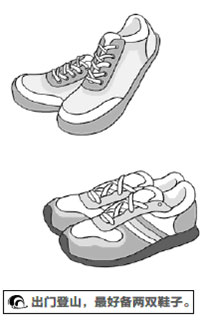 先來說一下鞋子。身體尚好,腳力尚健的老人如出門登山,應該準備登山用的鞋,而且最好兩雙,一雙是上山用的,前薄後厚,一雙是下山用的,前厚後薄。鞋底後半部加厚,可以防止上山時身體向下滑;鞋底前半部加厚,可以防止下山時身體向前傾。