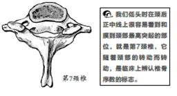 第7頸椎除了伸向後方的棘突很長外,其餘結構和普通頸椎一樣。由於其棘突很長,末端不分叉而呈結節狀,隆突於皮下,而又被稱為隆椎。它隨著頸部的轉動而轉動,是臨床上辨認椎骨序數的標誌。我們低頭時在頸後正中線上很容易看到和摸到頸部最高突起的部位,就是第7頸椎,這是第7頸椎的生理特點。