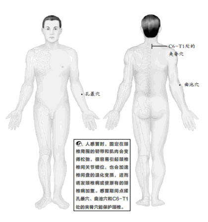 如果已發生病變可採用手法正脊復位。如果只是普通感冒,為了防止誘發頸椎病,一定要先治好感冒,可點揉孔最穴和曲池穴,並配C6-T1處的夾脊穴。