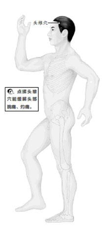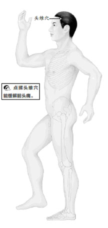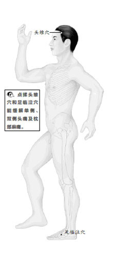像這種情況,平時如何保健呢?可練習刁氏脊椎保健操的第一、二、三節(詳見本書第7章)。平時多點揉頭維穴,並配足臨泣穴。