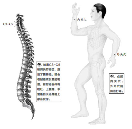 導致呃逆的原因有很多,但是很多人想不到的是,頸椎不適也會引起呃逆。因為膈神經位於C3-C5椎間關節部位,如果C3-C5椎間關節錯位,壓迫了膈神經,就會引起連續反覆的呃逆,有時還會伴有嘔吐、上腹痛,不管是白天還是晚上都會發作。