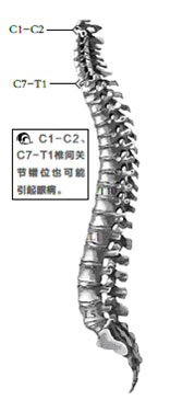 C1-C2、C7-T1椎間關節錯位時,關節突有偏移,椎骨四周韌帶、橫突前方斜角肌緊張,有索狀物,直接壓迫頸上交感神經節和星狀神經節,就會造成視力下降,模糊不清,復視等。