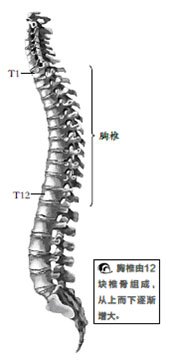 胸椎是由12塊椎骨組成的。從人體解剖學來看,典型的胸椎椎骨都有椎體、椎弓和突起,椎骨自上而下(即T1至T12)逐漸增大。在椎體的後面有棘突,側面有橫突,上下各有兩個關節突。在椎體側面後部近椎體上緣和下緣處,各有一個半球形肋凹,與肋骨形成肋頭關節。