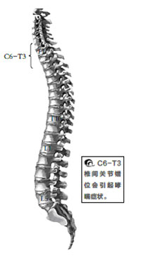 怎麼發生的呢?C7-T3一旦受到損傷,發生錯位後,壓迫了支配肺及支氣管的神經,就會引起肺及支氣管方面的病。這種由胸椎導致的支氣管病發病前期,會有頸部、肩部酸累疼痛的現象,自己會感覺肩部好像背了一件很沉的東西似的;同時還會有頭暈、頭痛、失眠多夢、多汗、心慌、煩躁、愛發火、氣促、胸悶等症狀。發病時,以咳嗽、咳痰、氣喘及反覆呼吸道感染為主。當然,這種由胸椎病變引發的支氣管病症,會因為胸椎的正脊復位而好轉。
