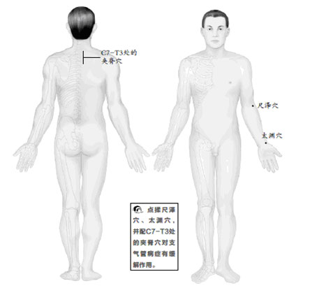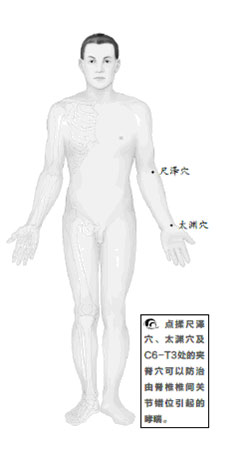 平時堅持練習脊椎保健操的第五、六節(詳見本書第7章);多點揉尺澤穴、太淵穴,並配C7-T3處的夾脊穴。太淵穴是手太陰肺經上的穴位,它在腕掌橫紋橈側,橈動脈搏動處。太淵穴可補肺氣,它是肺經中元氣聚集最多的地方。此處就相當於肺經的源頭,肺氣便是由這裡源源不斷地運往全身各處。中醫有「肺朝百脈,脈會太淵」的說法,因此刺激太淵穴就如同深挖井一樣,使肺氣源源不斷地運往全身,補肺氣的效果最好。