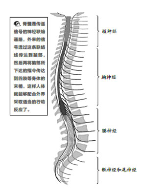 可以說,脊髓是傳遞信號的神經聯絡通路,外來的信號通過這條聯絡線傳達到腦部,然後再將腦部所下達的指令傳達到四肢等身體的末梢,這樣人體就能夠配合外界採取適當的行動反應了。此外,脊髓也是內臟傳達信號的自主反射中樞,具有控制內臟與血管正常運作的功能。