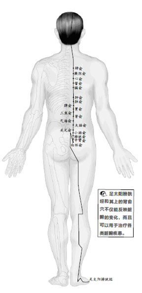 我們可以看出,古人說的經絡既有傳遞信息的「神經」作用,還有運輸營養的「血管」作用。古人在千百年的醫療實踐中在脊椎兩側找到了「臟腑之氣的疏通出入之處」——足太陽膀胱經和背俞穴。古人認為,足太陽膀胱經和其上的背俞穴是臟腑經氣輸注於背部的經絡和穴位。某一穴位與相對應的臟腑在生理功能、病理變化方面有著密切的聯繫,它不僅能反映臟腑的變化,而且可以用於治療各類臟腑疾患。