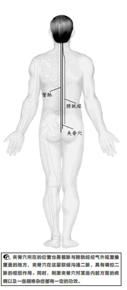從經絡在全身的分佈上看,夾脊穴位於督脈與足太陽膀胱經之間,因此它與這兩者關係密切。夾脊穴所在的位置也是督脈與膀胱經經氣外延重疊覆蓋的地方,夾脊穴在這裡聯絡溝通二脈,具有調控二脈的樞紐作用。同時,刺激夾脊穴對某些內臟方面的疾病及一些疑難雜症都有一定的特殊功效。