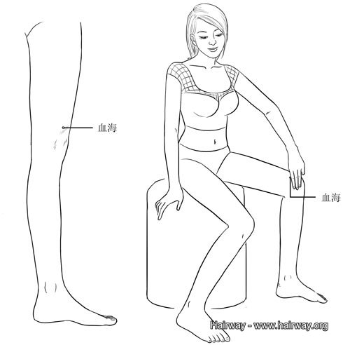 提示:取穴時採用仰臥或正坐、屈膝的姿勢,血海位於大腿內側,從膝蓋骨內側的上方。