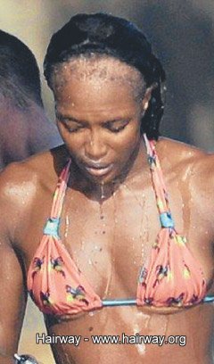 據美國網站報導,超級名模黑珍珠娜歐蜜坎貝爾日前現身西班牙海灘,與男友一同享受假期。身穿藍橘相間豔麗顏色比基尼亮相的她,展現火辣身材。不過,眼尖的狗仔馬上發現她的髮線怪怪的。