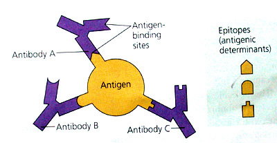 每個T細胞或B細胞上面有許多抗體 (antibody),就像上面那張圖裡面紫色的部分一樣,每個細胞有很多個抗體,但是同一個細胞表面的抗體會全部都一樣,也就是說抗體有很多種,但是一個B細胞或T細胞上面,只有一種抗體分布在上面。而一個抗原(antigen)則會有許多小部分 (epitopes) 可以讓某一個特定的抗體所辨認,所以一個抗原,有時候會需要三個抗體才能完全被辨認和結合。