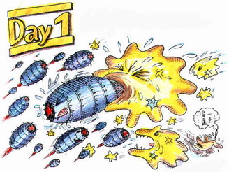 第九天,同時,兵工廠的B細胞製造出可攻擊病菌的抗體;抗體像巡弋飛彈一樣,可以精準地擊中病菌 (不會打到鴨子)。