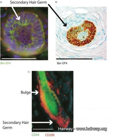 上層圖組顯示毛囊橫切面,綠色與棕色區域為原生細胞。下毛囊側視圖顯示幹細胞和原生細胞豐富的地區
