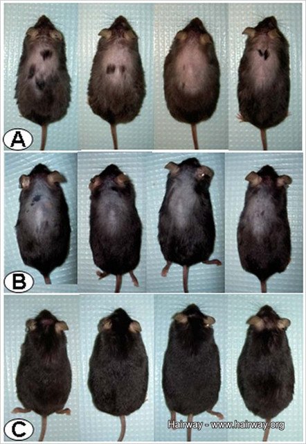 C排圖片中的老鼠是B排老鼠使用生髮治療藥物後的樣子。A排則老鼠被投以安慰劑。U.C.L.A./VA